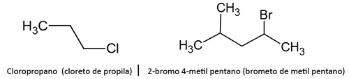 Hidrocarbonetos com pelo menos um H substituído por um halogênio (F, Cl, Br, I).